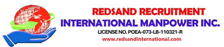 Redsand Recruitment International Manpower, Inc. is a land-based recruitment agency duly licensed by the Department of Migrant Worker (DMW) and Department of Labor and Employment (DOLE) specializing in the career placement of Filipino professionals and skilled workers for overseas employment.